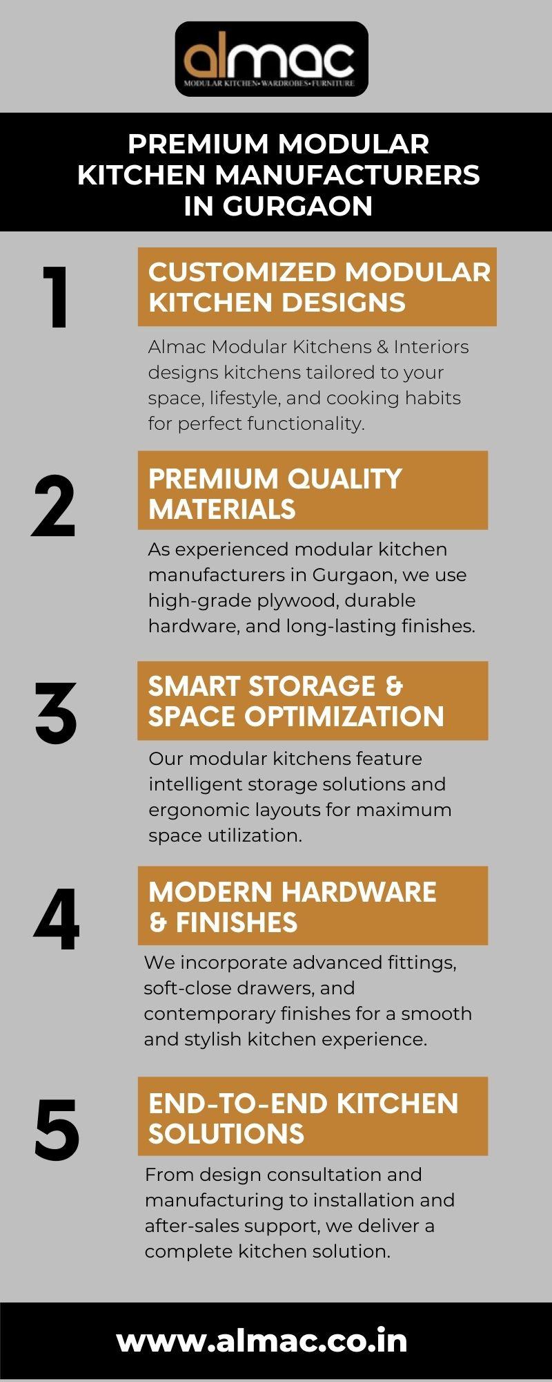 Looking for trusted modular kitchen manufacturers in Gurgaon? Almac Modular Kitchens & Interiors delivers innovative designs, premium finishes, and customized storage solutions. Our infographic highlights smart layouts, quality materials, pricing benefits, and end-to-end installation services. Upgrade your home with functional, stylish, and durable modular kitchens tailored to your space and lifestyle.