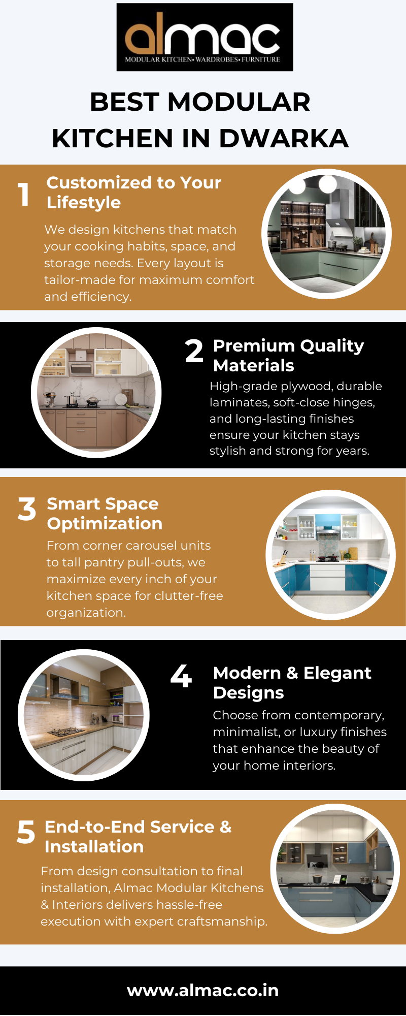 Discover premium modular kitchens in Dwarka with Almac Modular Kitchens & Interiors. Our custom designs combine elegance, smart storage, and modern functionality to transform your cooking space. From sleek cabinets to space-saving layouts, we create kitchens that inspire style and convenience for your home.